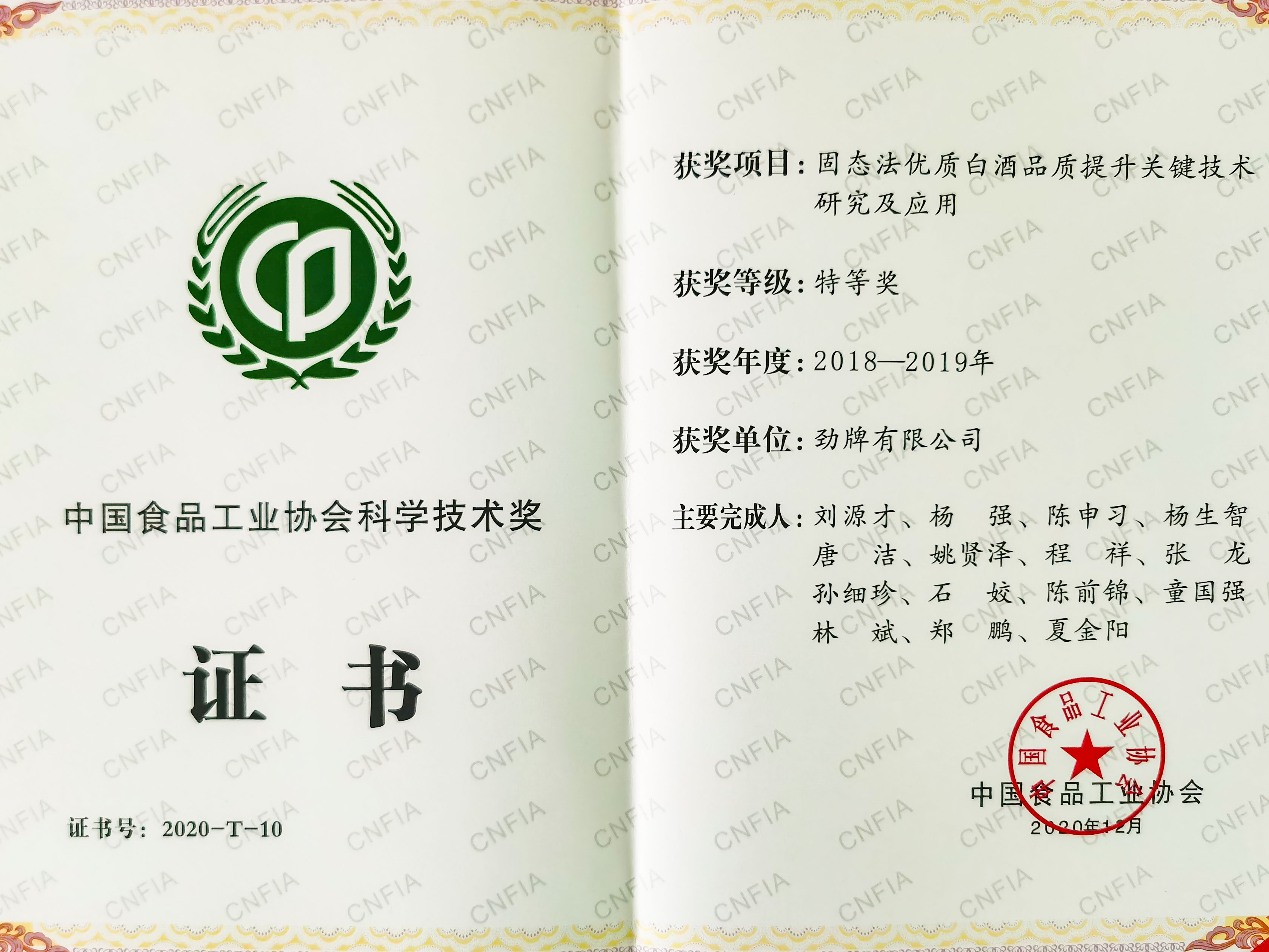 12月6日,2020第四屆中國食品產(chǎn)業(yè)發(fā)展年會暨華糖萬商大會全會在河南鄭州開幕。大會頒發(fā)了2020年度“中國食品工業(yè)協(xié)會科學(xué)技術(shù)獎”,勁牌公司《固態(tài)法優(yōu)質(zhì)白酒品質(zhì)提升關(guān)鍵技術(shù)研究及應(yīng)用》項目榮獲特等獎。