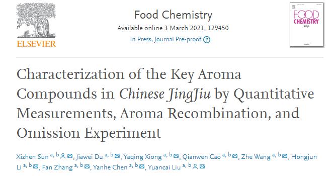 近日,國際學(xué)術(shù)期刊食品化學(xué)(Food chemistry,中科院1區(qū),影響因子為6.306)在線發(fā)表了《通過定量分析,香氣重組和缺失實驗表征中國勁酒中的關(guān)鍵香氣活性化合物》的研究文章。撰稿人正是來自勁牌研究院的風(fēng)味研究小組。